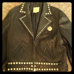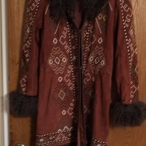 Red leather jacket with horse and star embroidery. Fringe details on sleeves and front. Button closure.