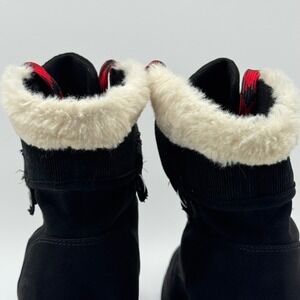 Embrace winter adventures with these stylish and functional ankle boots. Featuring a sleek black exterior, the boots boast eye-catching red plaid laces that add a pop of color. A plush faux fur trim peeks out from the top, providing warmth and a touch of luxury. The sturdy block heel and lug sole offer stability and traction, making them perfect for navigating snowy sidewalks or uneven terrain. Ideal for casual outings, weekend getaways, or adding a touch of rugged charm to your everyday style.
