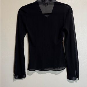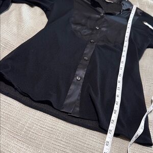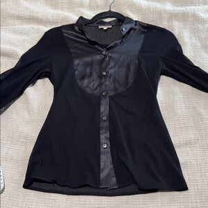 Chic black button down with satin accents. Long sleeves and classic collar. Perfect for elegant occasions.