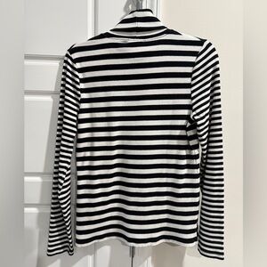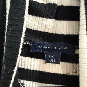 Tommy Hilfiger large turtleneck with black and white horizontal stripes. The stripes on the body are different size than the arms. Made with a cotton/polyester blend.