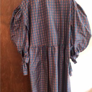 Insane Elzinga blue, red and green plaid babydoll dress with exaggerated bow. Size small, but oversized fit. Could easily be a medium. Made from smooth silk with a subtly gathered skirt, then flanked by long balloon sleeves that can be fastened higher up the arm with the ties. Such a show-stopping dress. Sold out online and only worn twice.