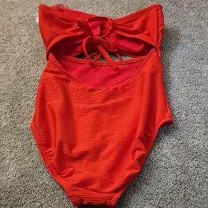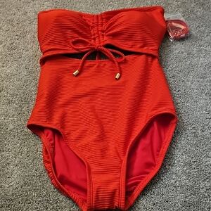 Elegant red one-piece swimsuit. Features a stylish ruched front. Ideal for beach or pool.
