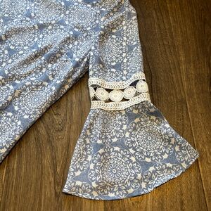 Chic blue dress with white intricate patterns. Features stylish bell sleeves. Ideal for versatile wear.