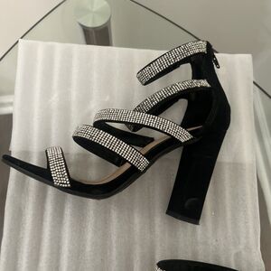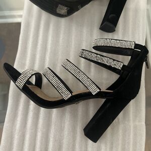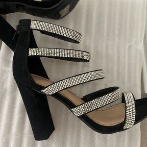 Stylish black strappy heels by Bamboo featuring multiple rhinestone-embellished straps and a block heel design. These shoes are being sold AS-IS due to damage.