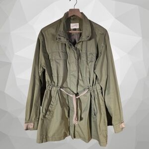 Chic olive utility jacket with adjustable waist. Elastic across the back of waist.
