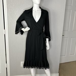 This Vintage 90s Express Wrap Dress in black with ruffle bell sleeves is a whimsical and feminine piece perfect for various occasions. The dress features a V-neckline, 3/4 sleeves, and a midi length, making it suitable for workwear or parties. The bell sleeves and ruffle accents add a gothic and whimsigoth touch, while the tie closure and layering details give it a unique and charming look. Made of polyester, this dress is machine washable for easy care, and is a size 10 with a regular fit for women who love the 90s style.