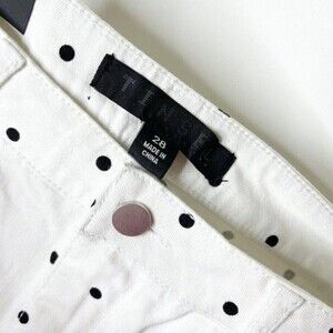 Tiny dots deliver retro charm on a fraying stretch-denim miniskirt.