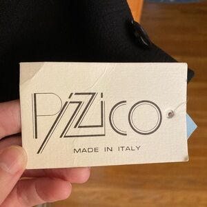 The blazer is a vintage Pizzico women's virgin wool black blazer with bows, made in Italy. The item is an elegant, fitted jacket featuring satin ribbon details and two small decorative bows on the upper chest.