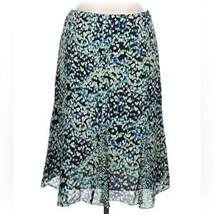 Beautiful Charter Club silk skirt featuring an abstract speckled print in blue, black, and white tones. Made from luxurious 100% silk with a full polyester lining for comfort. Flattering A-line silhouette with subtle flare at the hem, perfect for work, events, or dressed up casually.
