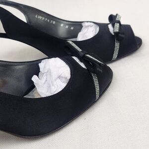 Gently used condition. No major flaws. Stuart Weitzman Black Peep Toe Sparkle Bow Heel Pumps