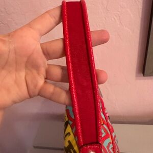 Bold Coach shoulder bag with zigzag pattern. Features red, orange, and blue elements. Excellent condition.