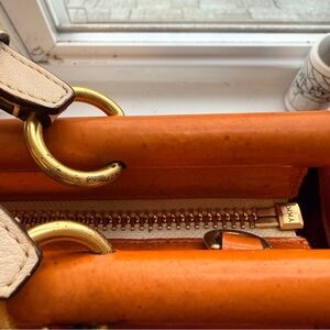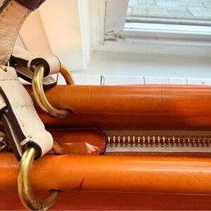 Coach Louisa satchel with color block coral and beige leather with tangerine trim. Gorgeous burgundy lining is in excellent condition. Features a top handle and front pocket. Very spacious. Ideal for daily use.