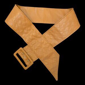Women's retro faux leather camel/tan belt with wrapped buckle and diamond quilting. Excellent pre-owned condition. Width 3.25" Length 42.5"