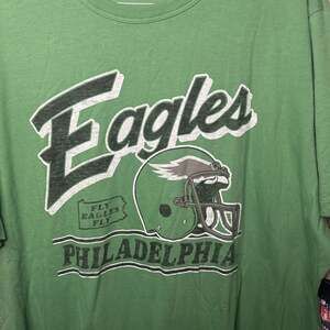 Show your support for the Philadelphia Eagles with this vibrant green '47 NFL Fly Eagles Fly T-Shirt. Made from 100% cotton, this tee features bold Eagles graphics, including the team name, helmet, and 'Fly Eagles Fly' slogan, celebrating your favorite NFL team. This shirt is brand new with tags, ensuring authenticity and quality. Perfect for game day, casual wear, or as a gift for any Eagles fan. The comfortable fit and classic design make it a versatile piece for your sports apparel collection. Officially licensed NFL product.