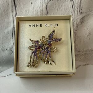 Celebrate whimsy and romance with this Anne Klein Love Birds motif pin adorned with sparkling stones and rich purple accents. The charming piece features a secure pinned closure and arrives in a gift box, suitable for gifting or adding a playful touch to your outfit.