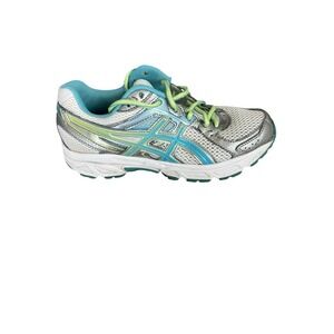 Used pair of ASICS Gel Contend 2 running shoes for women in a turquoise and lime colorway. Size 6.5 W USA. Still in pretty good shape. There's some minor damage on the tip of one of the shoe strings. Shown in pictures.