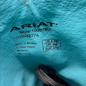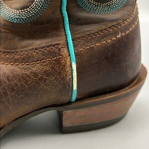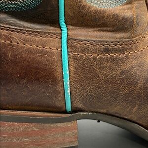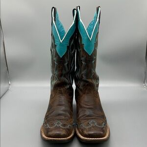 Super cute Ariat boots. Square toe with tons of pretty teal details. Boots show minimal wear with some slight scuffing on the piping.