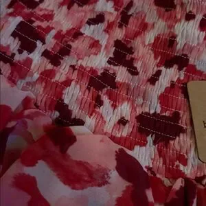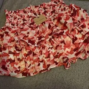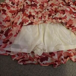 Chic mini skirt with vibrant red and pink floral design. Features playful ruffles for added flair. Perfect for a stylish look. Shorts in side skirt …