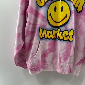 Chinatown Market Smiley Originals hoodie in a size small, featuring a pink and white tie-dye base with the iconic yellow smiley face graphic and bold “Chinatown Market” text across the front. The design has a spray-painted, graffiti-style look that gives it a true streetwear vibe. Includes a hood with drawstrings and a front kangaroo pocket for comfort and everyday wear. Soft, cozy, and easy to style with jeans, cargos, or joggers. Overall good pre-owned condition.
