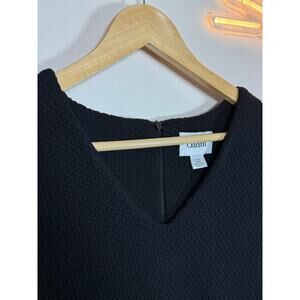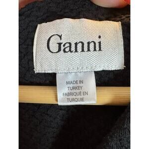 The "Ganni Fulton" is a dress that was part of a collaboration between Ganni and Anthropologie. It is a black mini dress featuring a V-neck, 3/4 sleeves, a textured knit bodice, and a pleated skirt. It has a back zipper and is made of a thicker textured fabric, primarily cotton with some elastane for stretch.