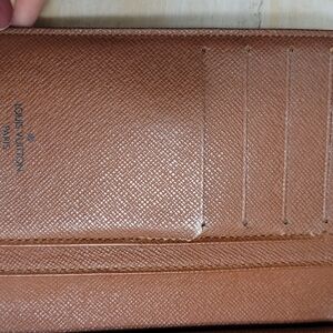 Elegant Louis Vuitton wallet with iconic monogram design. Features brown and gold tones.