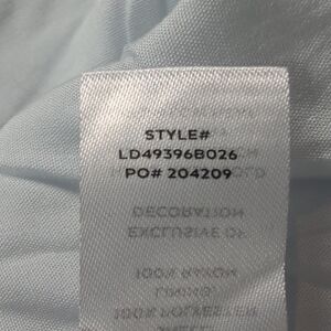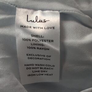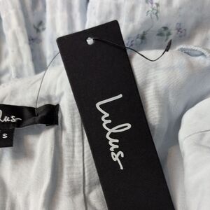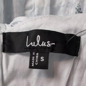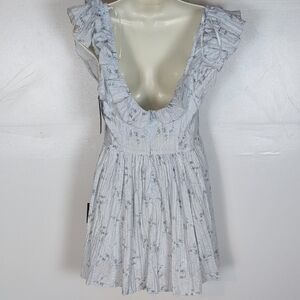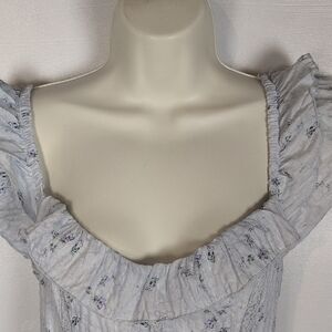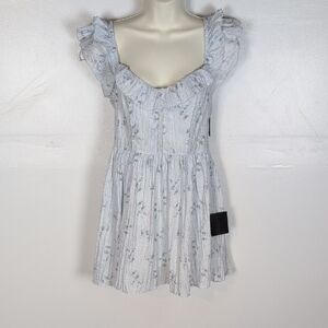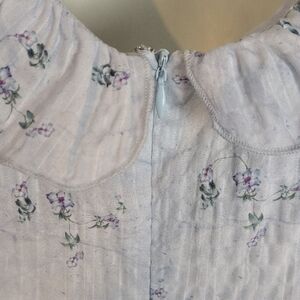 Light blue ditsy floral print. Ruffled, sweetheart neckline. Fitted bodice with delicate lace panels. Tiered flutter sleeves. A-line skirt. Back zip. New condition -- no flaws. Laid flat pit-to-pit: 16in. Laid flat waist: 14in. Shoulder to hem: 31in.