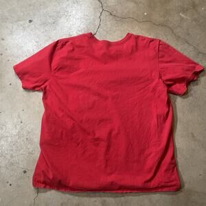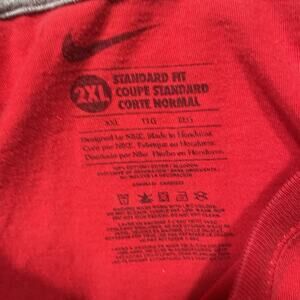 The product is a men's red Texas Rangers baseball Nike T-shirt in size 2XL. The short sleeve shirt features a solid pattern with a crew neck and is made of cotton knit fabric. It is machine washable and designed for a regular fit, perfect for casual wear in all seasons. The shirt also includes the Nike Regular Fit logo as an accent, adding a touch of style to the classic design. Ideal for fans of the Texas Rangers or baseball enthusiasts looking for a comfortable and trendy shirt.