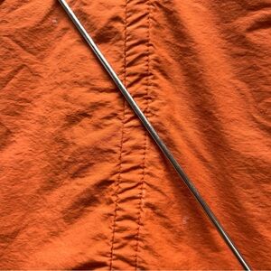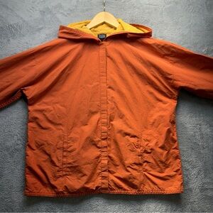 Bright orange windbreaker with a hood. Ideal for casual wear.