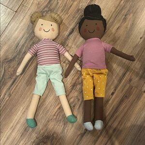 Delight your child with this adorable plush doll set. Featuring a charming design with striped outfits, these dolls are perfect for imaginative play. The set includes a doll with a pink and white striped shirt and mint green pants, and another with a pink shirt and mustard yellow pants. Ideal for cuddling and creative adventures. Smoke and pet free house