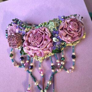 This ornate handmade Victorian-style choker features hand worked lilac-pink roses nestled in between vintage textiles and delicate bead embroidery. The delicate scalloped fringe, crafted from antique crystal, glass, acrylic and plastic to create texture and colors dance with every move. Wearable art for a regency-inspired tea party or adding a whimsical touch to a corset and silk skirt