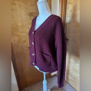 Chic maroon cardigan with a textured knit. Features button-up front and handy pockets. Ideal for layering.