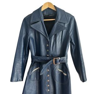 Vintage Mod Leather Belted Car Coat Jacket 1960s 1970s Blue Navy Snap Midi length Women Leather Dark Blue Jacket Winter Fall Autumn Classy Edgy