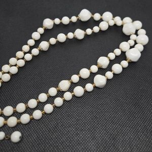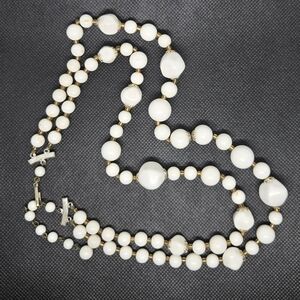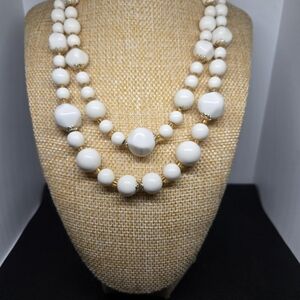 Vintage 15 inch adjustable necklace with a two-strand, graduated design. White plastic beads with small, gold-tone spacer beads between the main white beads. This style of bold, "gumball" or "chunky" bead necklace was a popular statement piece in the mid-century fashion era.