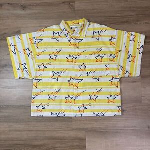 Vintage Union Bay M Star Print Stripe Polo Shirt Yellow White Stripe Funky 80s