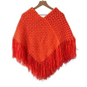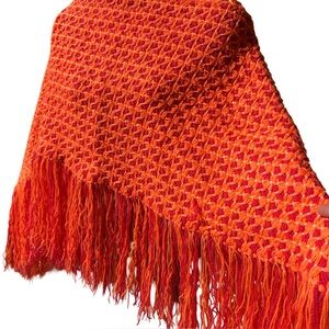 Handmade Crochet Fringe Poncho Orange Pink Boho Retro Fall Layering