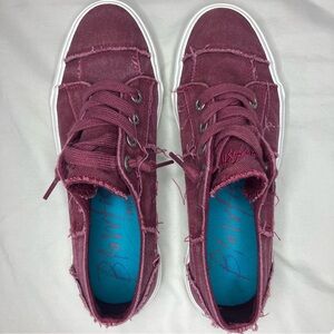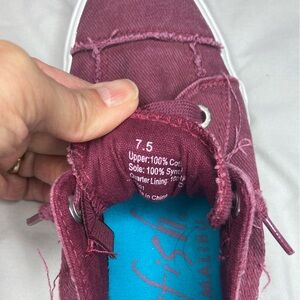 Casual maroon sneakers with a rugged look. Crafted from sturdy canvas. Offers all-day comfort.