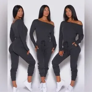 Elevate your style with this chic off-shoulder charcoal jumpsuit. Perfect for casual outings or lounging in comfort. Features a drawstring waist for a flattering fit.