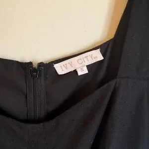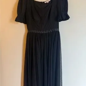 Only worn once. Excellent condition. Like new.Chic black midi dress with puff sleeves. Perfect for elegant occasions. Timeless and stylish design.