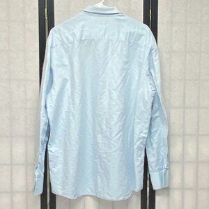 Long Sleeve Embroidered Print Tailored Button Down Shirt from INC, International Concepts. Lovingly worn – looks in new condition. Traditional relaxed silhouette in light chambray blue with dark blue print, accented with cream embroidery. Lightweight linen blend shirt is designed with collar and button front. Long sleeves with pleat and button cuff. Slightly dropped shoulders and a back yoke. Tailored relaxed fit that hits below the hips with lightly curved shirttail hem. A versatile staple you can wear year-round.