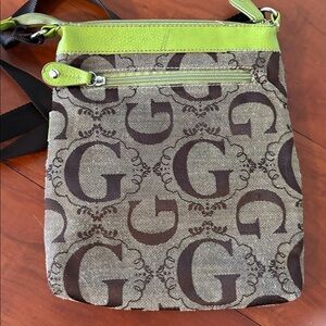 Y2K Guess crossbody bag featuring bold green faux leather trim, studded details, and eye-catching patchwork fabric with iconic Guess “G” logo print. Early-2000s vibe with animal print accents and rhinestone studs — total statement piece.