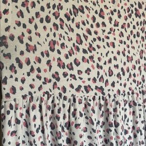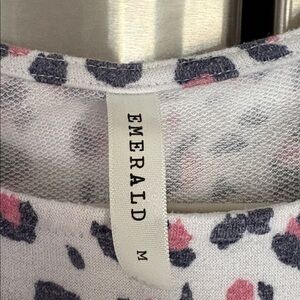 Chic Emerald women’s flowy tunic with a playful leopard pattern. Features pink, grayish blue, and white hues. Ideal for casual wear. EUC!! Has wash wear. I always wore it with a pink pencil skirt with it. Size medium but it could fit a smaller large also. The material is soft almost like a terry cloth.