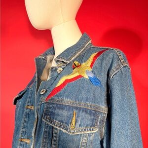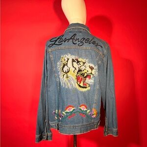 Blue denim jacket with vibrant tiger and bird embroidery and Los Angeles across the back and front lapels. Eye-catching and unique style! Kinda ed hardy vibe. Can be unisex! Some wear around pockets but adds to a vintage denim distressed feel! Noted in photos for you to look
