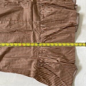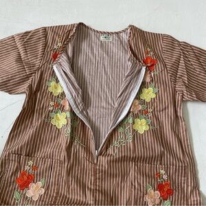 Brown striped dress with floral embroidery. Features short sleeves and pockets.