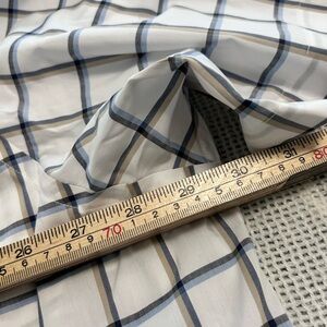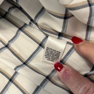 This shirt is white with gray, brown & white stripes. It is wrinkle resistant.