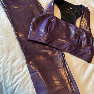 Shine in this metallic purple set. Includes leggings and matching top. Stylish and comfortable.