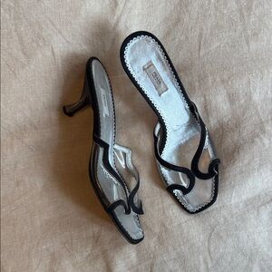 Chic 2000s Prada sandals with a black and silver palette. Stylish heel design for a modern look.