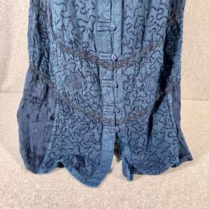 Keywords: Naqui New York, women's skirt, maxi skirt, blue skirt, embroidered skirt, button-down skirt, rayon skirt, knit fabric, long skirt, comfortable skirt, pre-owned skirt, India-made skirt.