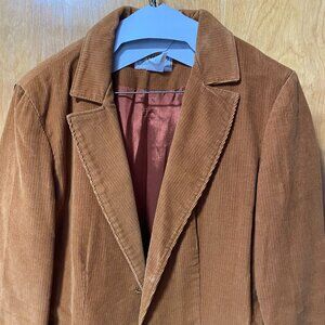 This is a rust colored corduroy blazer with a rust colored nylon lining. Two button front, Comes from Action West. Size 13-14. Never worn. New condition.
