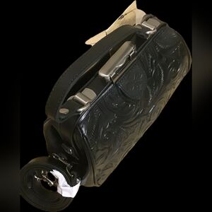 Elevate your accessory collection with this sophisticated Brand New With Tags (NWT) Patricia Nash Gracchi Frame Satchel. Crafted from luxurious, genuine leather featuring a stunning raised floral tooled design in deep black, this bag is the perfect blend of vintage inspiration and modern functionality.