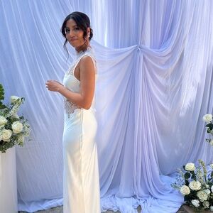 Elegant cream dress with intricate lace detailing. Perfect for weddings.